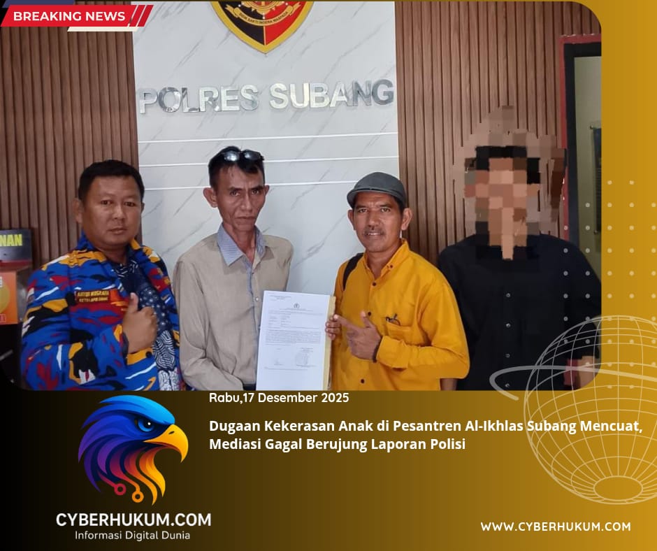 Subang, Jawa Barat | Cyberhukum.com |Dugaan tindak pidana kekerasan terhadap anak di bawah umur disertai pengeroyokan yang terjadi di lingkungan Pondok Pesantren Al-Ikhlas, Karangwangi, Kecamatan Binong, Kabupaten Subang, kini resmi memasuki jalur hukum. Kasus yang semula diupayakan diselesaikan secara kekeluargaan itu akhirnya dilaporkan ke pihak kepolisian setelah mediasi berbulan-bulan dinyatakan gagal.
